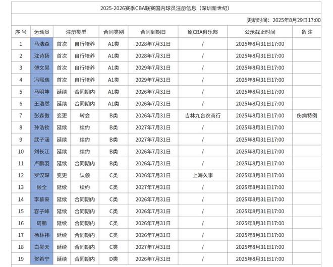 北京时间8月29日,CBA官网更新了内援注册名单,深圳男篮在此次更新中将内援注册名额全部使用完毕。