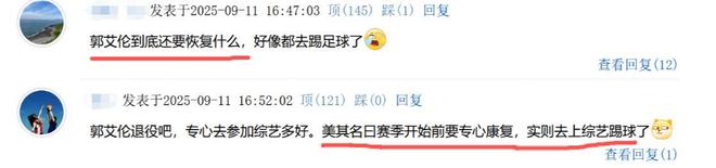 这边不归队合练,那边的东北明星足球赛,郭艾伦则是现身绿茵场,并且秀了一把自己运球突破到门前的好戏,这也引起了球迷的热议:“郭艾伦到底要恢复什么,好像都去踢足球了”、“综艺是主业、打球是副业”、“退役吧,专心参加综艺多好,美其名曰赛季开始前要专心康复,实则去上综艺踢球。”