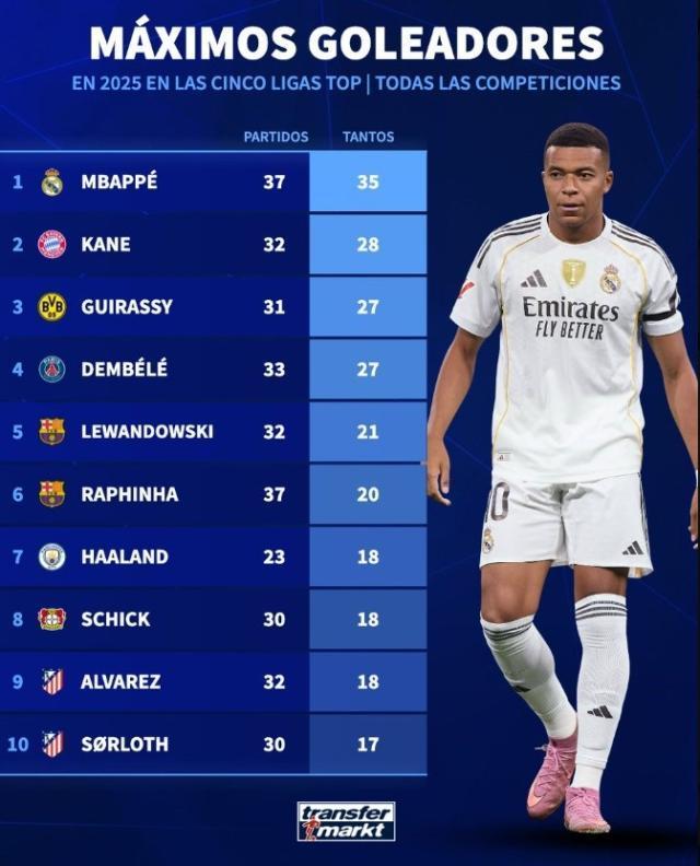 进入2025年,皇马球星姆巴佩展示出了非常出色的状态,他在37场各项赛事比赛中打进35球,位居五大联赛射手榜榜首。以下为2025年五大联赛射手榜top10: