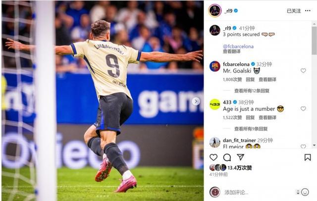 莱万社媒晒出自己庆祝进球的照片,配文:三分到手