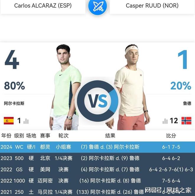 职业生涯至今,鲁德和阿尔卡拉斯交锋五次,四连败之后取得了去年ATP都灵年终总决赛小组赛的一场胜利。如今来到ATP500东京站半决赛,一方面阿尔卡拉斯带伤作战,一方面鲁德在低级别赛事中向来表现出色,此消彼长之下,这场激情碰撞必定激烈胶着,胜负难以预料。