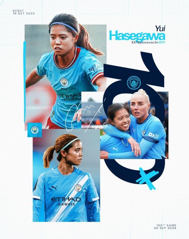 曼城女足官方消息,长谷川唯完成曼城100战里程碑。