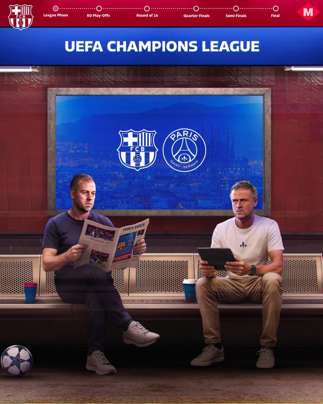海报中,两位主帅坐在长椅上,等待着列车的到来。恩里克手中拿着PAD,而弗里克则在一旁看着报纸,报纸上的新闻是2016/17赛季欧冠1/8决赛次回合,巴萨主场6-1逆转巴黎的诺坎普奇迹。有意思的是,当时的巴萨主帅恰恰是坐在弗里克旁边的巴黎现任主帅恩里克。