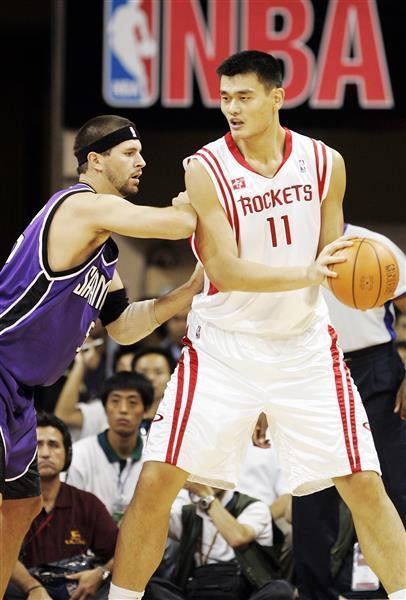 2004年10月14日休斯顿火箭队中锋姚明(右)在比赛中进攻。当日,2004NBA中国赛首战在上海开战,休斯顿火箭队以88比86战胜萨克拉门托国王队。 新华社记者 李岳摄