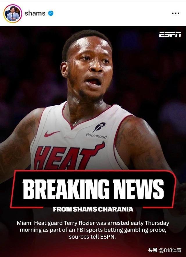 名记Shams随后也进行了相关报道,Shams表示,热火队后卫特里·罗齐尔于周四凌晨被捕,此事与联邦调查局(FBI)体育博彩调查有关。