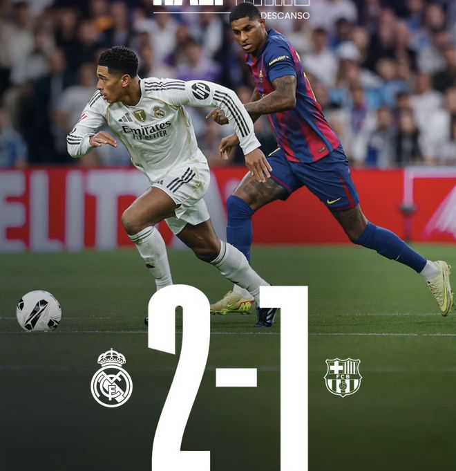 第37分钟,居莱尔在后场处理球拖沓,被巴萨抢断,拉什福德助攻费尔明进球,1-1!第43分钟,维尼修斯在左路强突后传中,米利唐头球摆渡到门前,贝林厄姆轻松打空门进球,皇马再次领先。上半场结束皇马2-1,皇马的状态明显更好,尤其是几名攻击手,巴萨防线略显狼狈。下半场第52分钟,贝林厄姆造点后,姆巴佩主罚质量不高,踢了一个半高球,而且角度也比较正,被什琴斯尼扑出。贝林厄姆为皇马打入本场第3粒越位进球,巴萨再次逃过一劫。