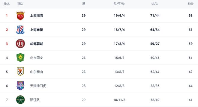 - 中超 | 中超最新积分榜:争冠格局再变,上港下轮战平夺冠,蓉城退出争冠
