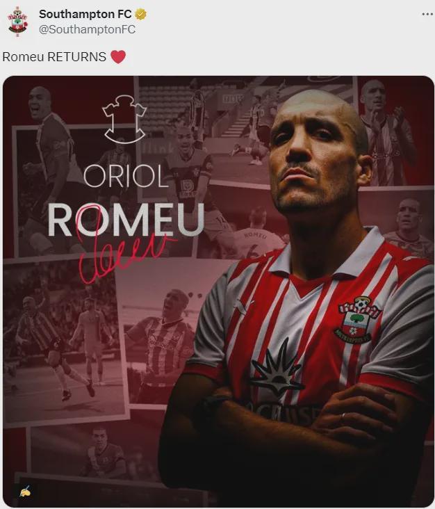 34岁的罗梅乌在10年前第一次加盟南安普顿,他在2022年转会加盟了赫罗纳,这名中场在今夏合同到期后离开巴萨成为了自由球员。