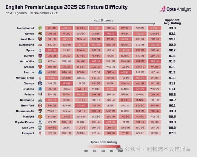 而未来8轮英超赛程,利物浦的难度从正数第一骤变倒数第一,也就是最容易,而阿森纳的难度排在第8。