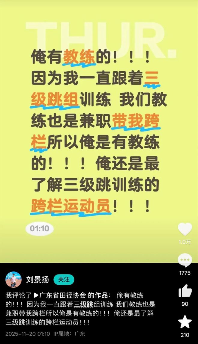刘景扬笑称自己是“最懂三级跳的跨栏运动员”,这可不是凡尔赛,而是在委婉地告诉大家,告诉国家田径队: