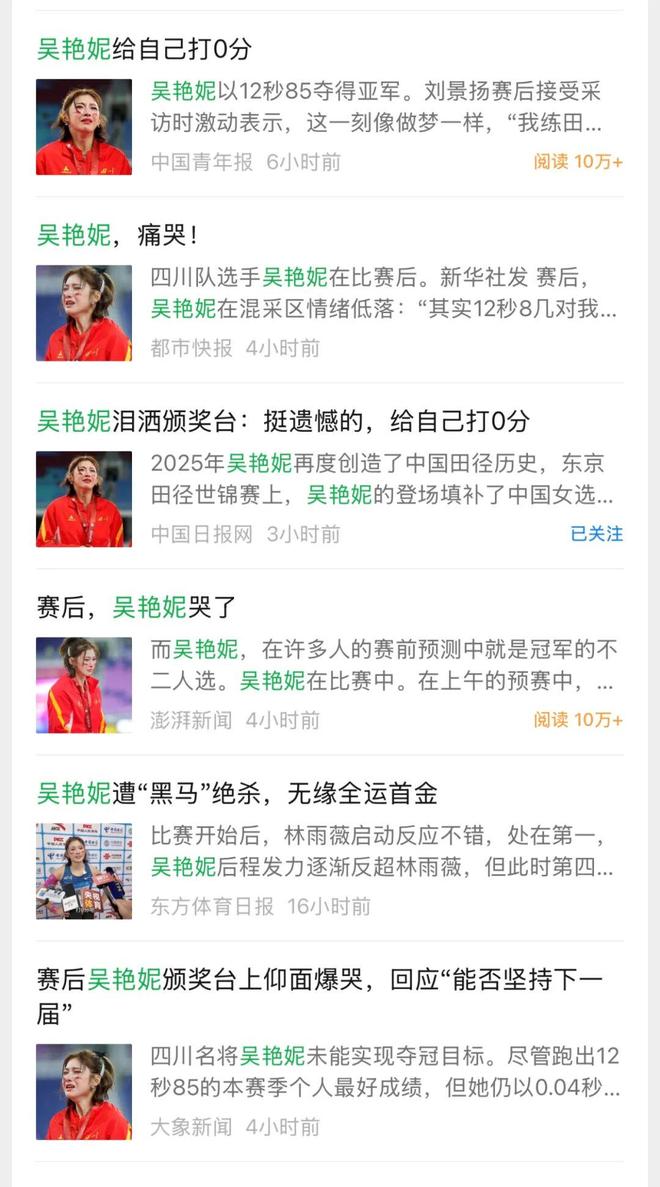 赛后的新闻媒体报道,几乎清一色把标题和头图聚焦在吴艳妮身上: