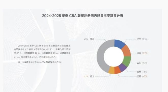 根据2024-2025赛季的CBA白皮书,我们可以看到河南篮球人才十分多,上赛季,CBA联赛一共有360名注册球员,从球员的籍贯来看,河南籍的球员一共有42人,这样的人数,可以排第二名,仅比号称篮球摇篮的辽宁差一人(辽宁籍的球员一共有43人),从这球员人数,充分说明了,河南同样是中国篮球的摇篮。