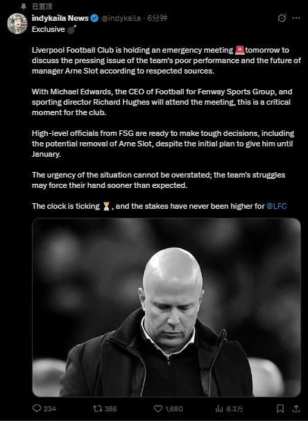 而来自转会信息博主indykaila News的最新消息,利物浦将于明天召开紧急会议,专题讨论球队近期糟糕的表现以及主教练斯洛特的未来。