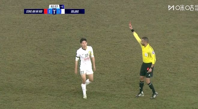 冲突持续了将近1分钟左右,之后主裁判介入,给曹永竞掏出红牌,再给双方的肇事者各掏黄牌一张。王刚引起冲突没红牌,为何曹永竞却染红呢?观察视频重放发现,原来有一名对手球员追着王刚讨说法,曹永竞上去就是一个右手卡脖(下图)。可能就是因为这个动作让主裁判将他罚下。