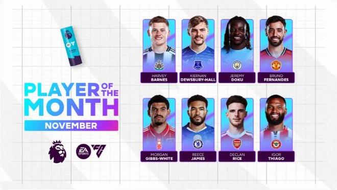北京时间12月4日,英超官方公布了11月最佳球员的候选名单,其中多库、B费、里斯-詹姆斯、赖斯等多人在列。