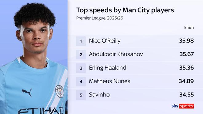 - 英超 | 时速35.98km,奥赖利创造曼城本赛季最快冲刺速度