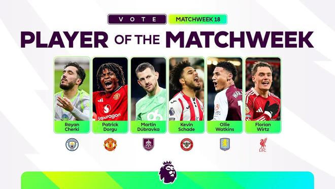 北京时间12月29日,英超官方公布了联赛第18轮最佳球员候选名单,这6名球员为谢尔基、多古、杜布拉夫卡、沙德、沃特金斯、维尔茨。